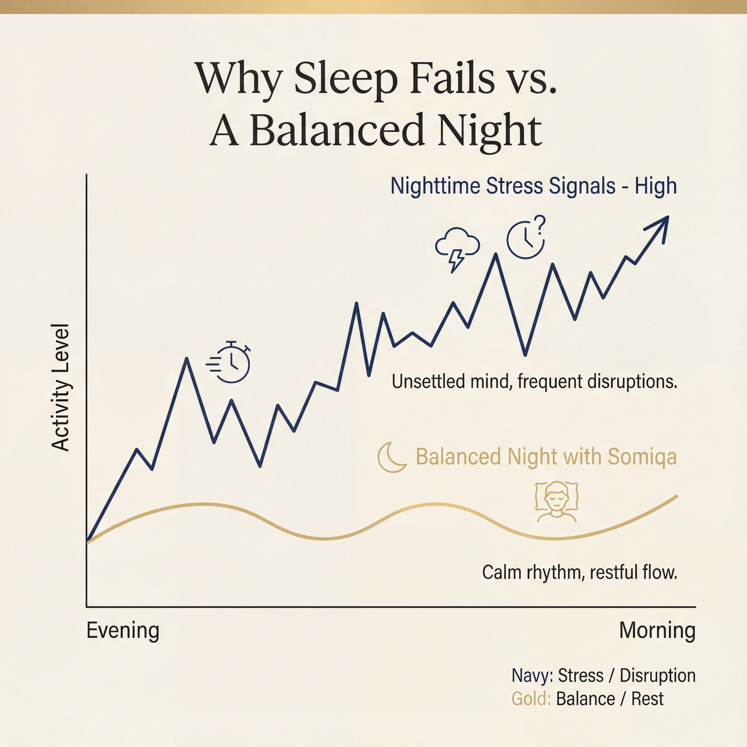 Somiqa™ is a melatonin-free, multi-pathway sleep support designed to calm a racing mind, relax the body, and support healthy nighttime stress rhythms, so you wake up clear, not sedated.